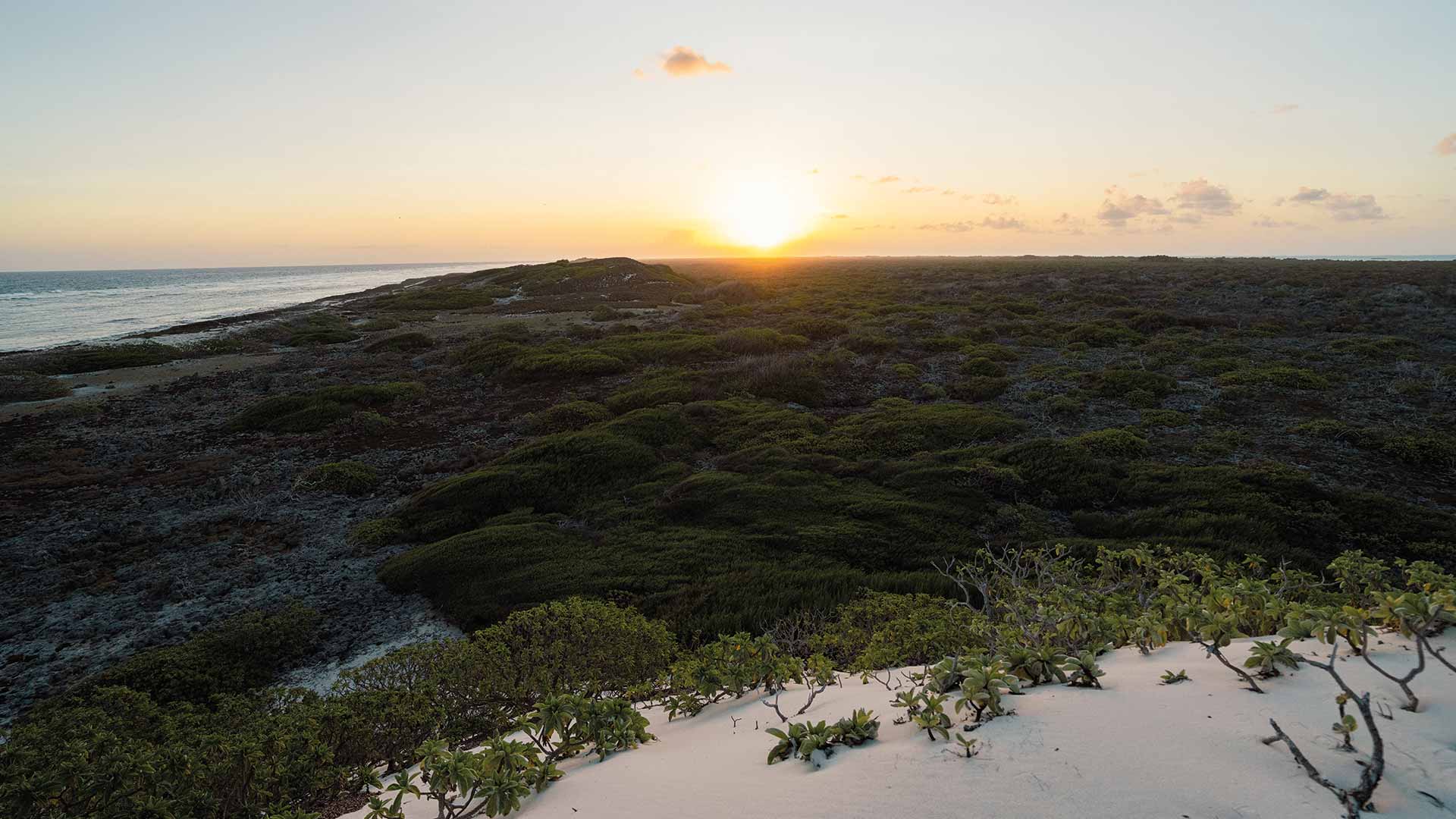 After waking, the Plastic Odyssey team decided to watch the sunrise from the top of the dune beside the DJL camp. Rising about twenty meters high, it is the atoll’s highest point. From up there, nature came alive in calm and color. Aldabra stretched out in every direction. The first light of day glowed orange and gold, as if the island were trying to seduce us.