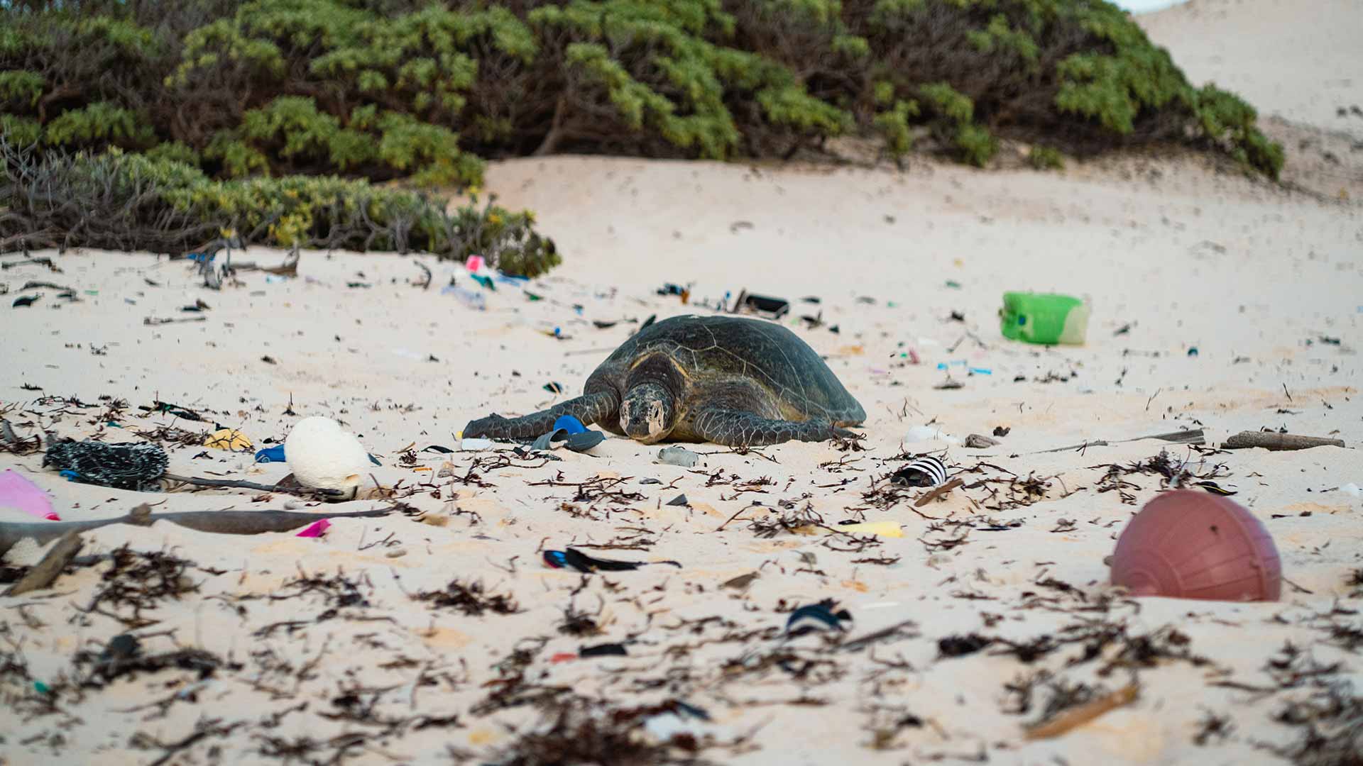 The sea turtle reaches the plastic debris: she skirts a fishing buoy, crushes a plastic bottle. Farther on, a tire, a few jerrycans, some sandals. Watching her struggle through this apocalyptic landscape feels unreal, deeply moving.